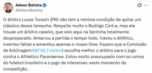 1/10/2025 @ 11:50 am Presidente do Atlético-GO, Adson Batista rasga o verbo após clássico e detona profisisonal: “Despreparado”Por: Dragao Goiano
