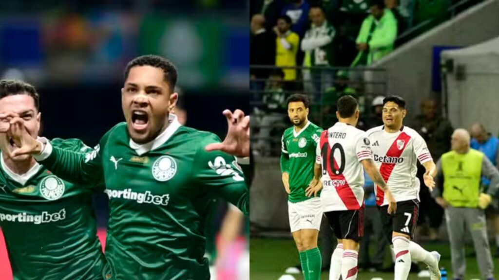 O jogo começou com tensão para o time de Abel Ferreira. Logo aos 7 minutos, após cobrança de falta de Quintero, Salas apareceu na primeira trave e subiu mais alto que a defesa para abrir o placar de cabeça. A vantagem argentina fez o Palmeiras encontrar dificuldades para criar e, mesmo com mais posse de bola, o time não conseguia furar a marcação. Armani ainda brilhou em cabeçada de Murilo, evitando o empate. Já nos acréscimos, Castaño quase ampliou para o River, mas parou em Weverton, que fez defesa crucial.